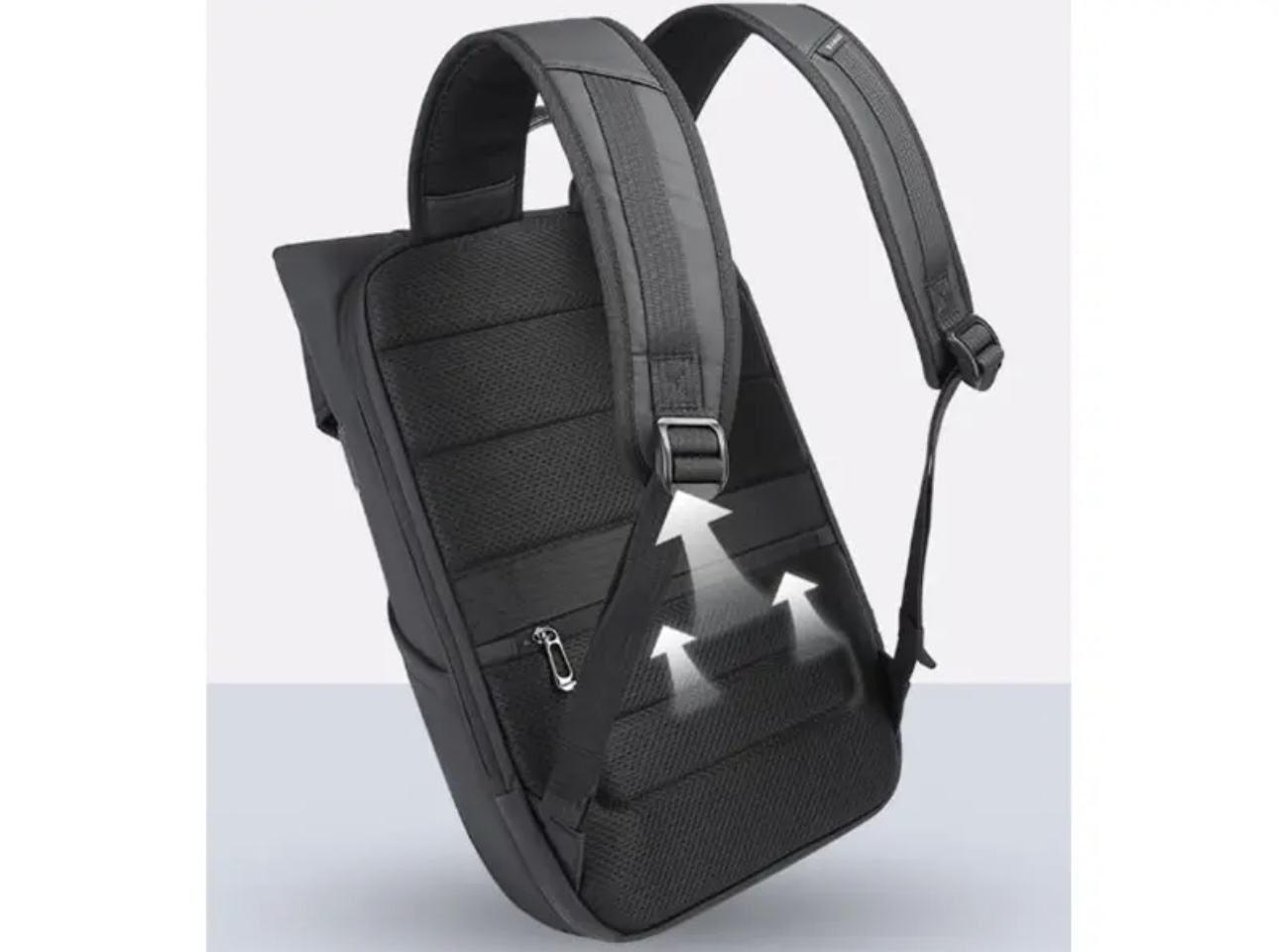 پشت کوله پشتی و بند های شانه ای پهن با اسفنج های الاستیک پوشانده شده تا کوله پشتی برای استفاده نرم و راحت باشد. به علاوه از تعریق جلوگیری می نماید. در قسمت پشتی نیز یک کمربند نایلونی تعبیه شده است که به لطف آن می توانید کوله پشتی را روی دسته کیف پرواز قرار دهید. همچنین یک جیب امن در این قسمت تعبیه شده که می توانید برای مثال گوشی یا کیف پول خود را در آن قرار دهید.