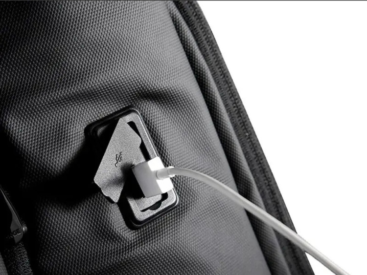 2. گوشی را با کابل مناسب به کانکتور USB در قسمت بیرونی کوله پشتی وصل کنید.